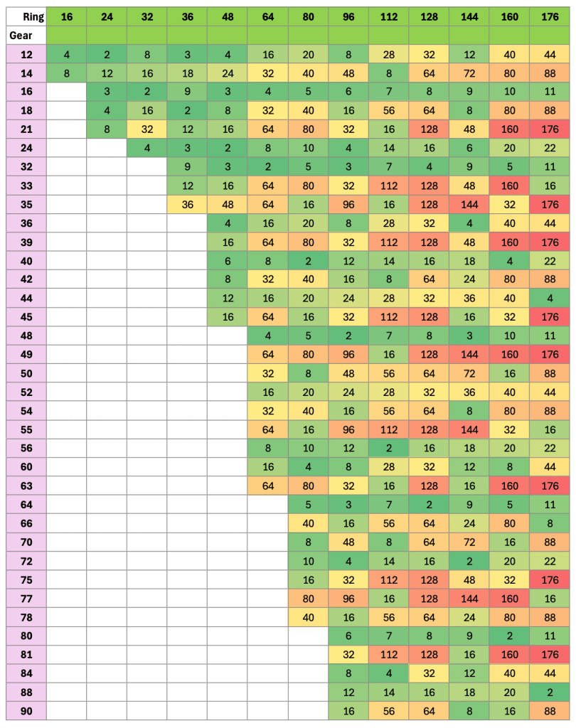 - When the ring and gear share many prime factors, the pattern is: