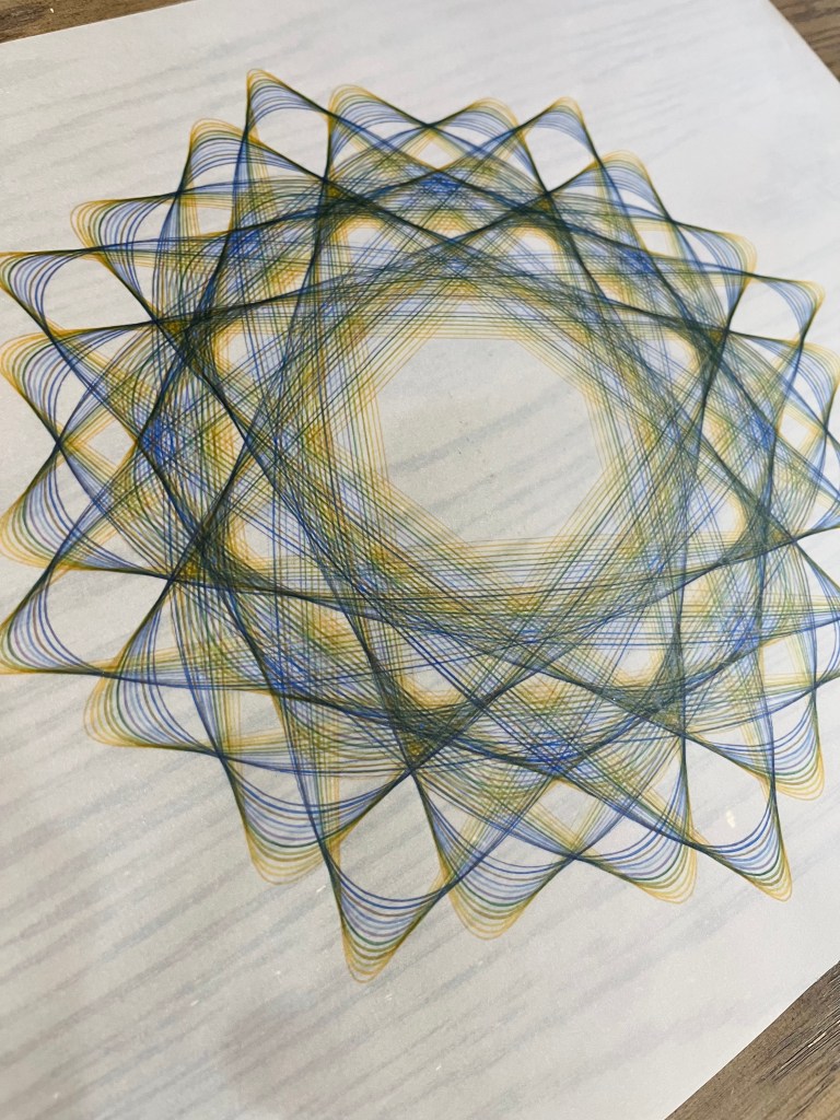 Running the same gear combination multiple times with different doughnut sizes creates layered ribbons of color—similar to what you’d see in professional geometric art.